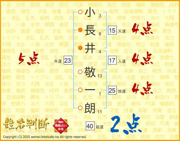 小(3画)長(8画)井(4画) 敬(13画)一(1画)朗(11画)
