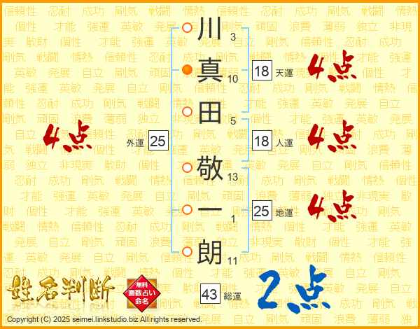 川(3画)真(10画)田(5画) 敬(13画)一(1画)朗(11画)