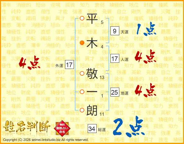 平(5画)木(4画) 敬(13画)一(1画)朗(11画)