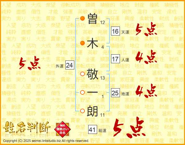 曽(12画)木(4画) 敬(13画)一(1画)朗(11画)