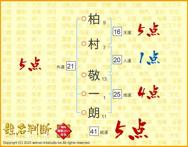 柏(9画)村(7画) 敬(13画)一(1画)朗(11画)