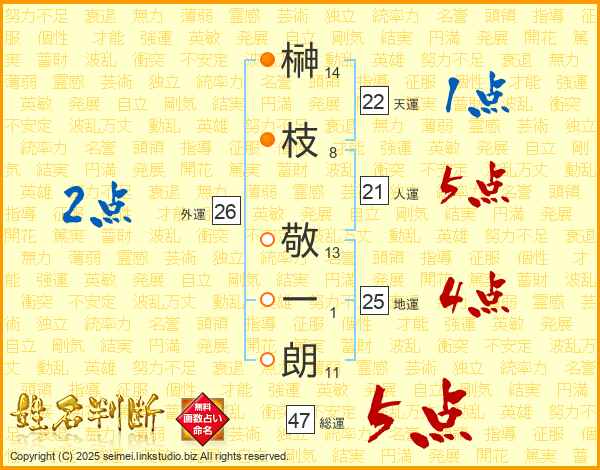 榊(14画)枝(8画) 敬(13画)一(1画)朗(11画)