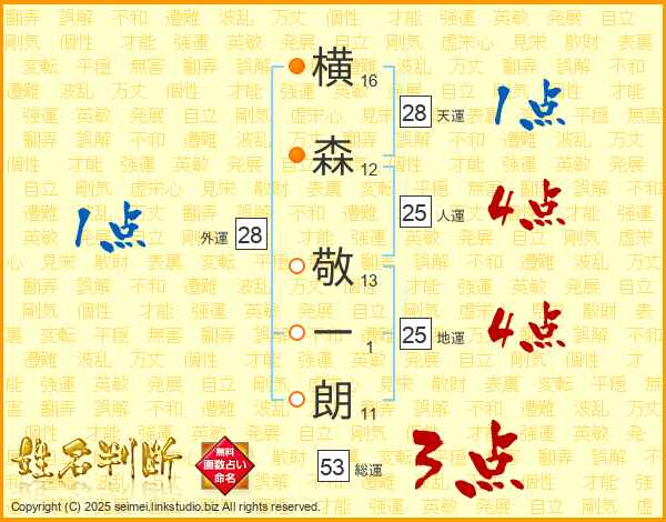 横(16画)森(12画) 敬(13画)一(1画)朗(11画)