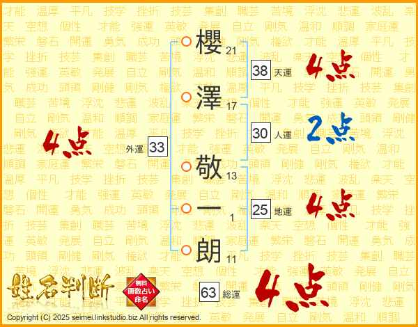 櫻(21画)澤(17画) 敬(13画)一(1画)朗(11画)
