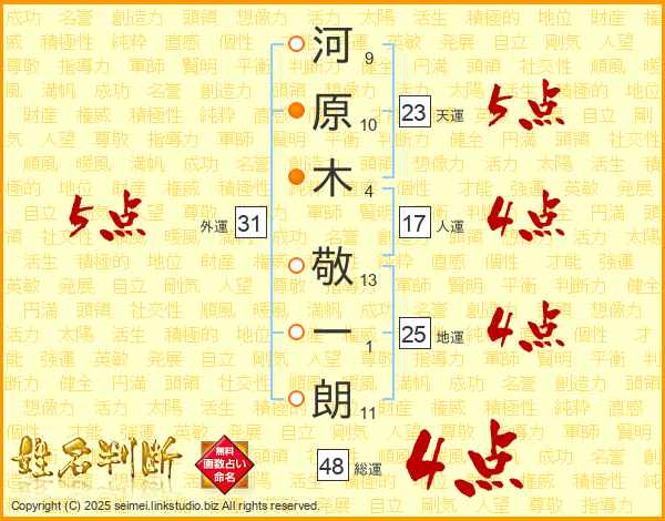 河(9画)原(10画)木(4画) 敬(13画)一(1画)朗(11画)