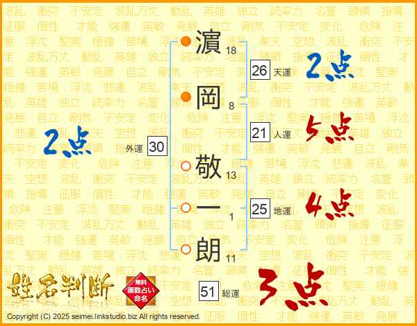 濵(18画)岡(8画) 敬(13画)一(1画)朗(11画)