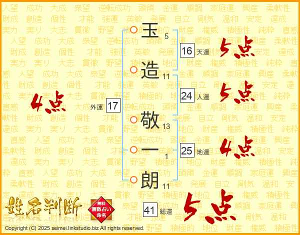 玉(5画)造(11画) 敬(13画)一(1画)朗(11画)