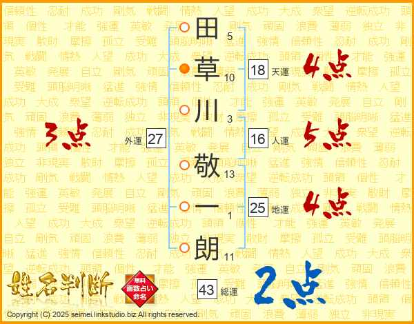 あなたの人生を表す1番重要な運勢です。生涯を通じて影響する総合運となり、主に50歳以降の晩年期に影響を及ぼします。苗字と名前の合計画数。