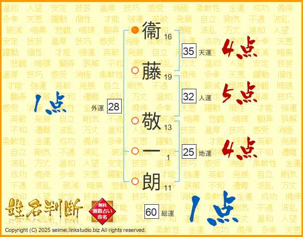 衞(16画)藤(19画) 敬(13画)一(1画)朗(11画)