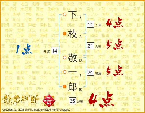 下(3画)枝(8画) 敬(13画)一(1画)郎(10画)