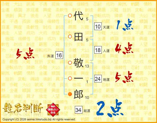 あなたの人生を表す1番重要な運勢です。生涯を通じて影響する総合運となり、主に50歳以降の晩年期に影響を及ぼします。苗字と名前の合計画数。