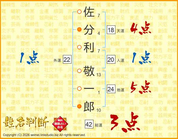 佐(7画)分(4画)利(7画) 敬(13画)一(1画)郎(10画)