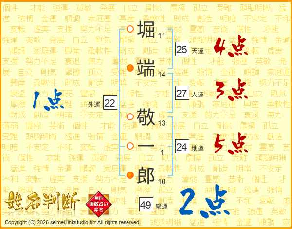 堀(11画)端(14画) 敬(13画)一(1画)郎(10画)