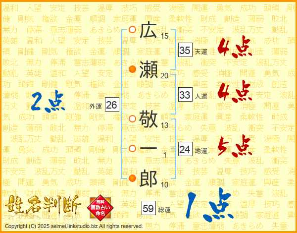 広(15画)瀬(20画) 敬(13画)一(1画)郎(10画)