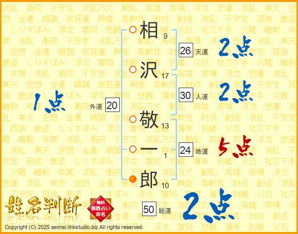 相(9画)沢(17画) 敬(13画)一(1画)郎(10画)