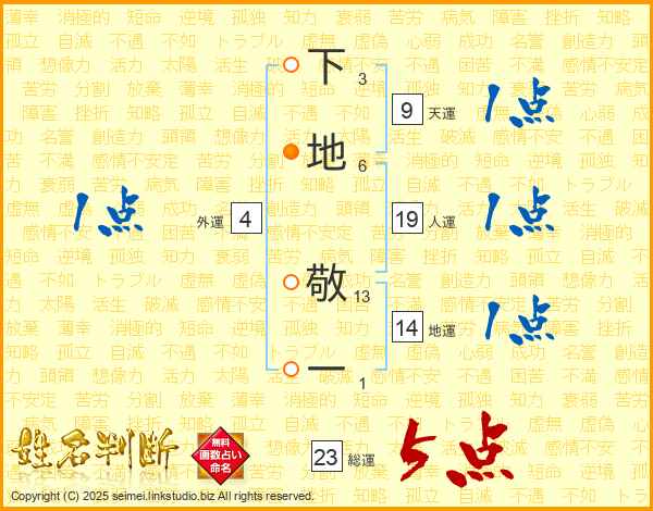 生活面を象徴する運勢です。外部から受ける影響力を表し、結婚運、家庭運や職場、環境への順応性を表します。総運から人運を引いた画数。姓や名が1文字の場合を除く。