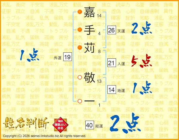 嘉(14画)手(4画)苅(8画) 敬(13画)一(1画)