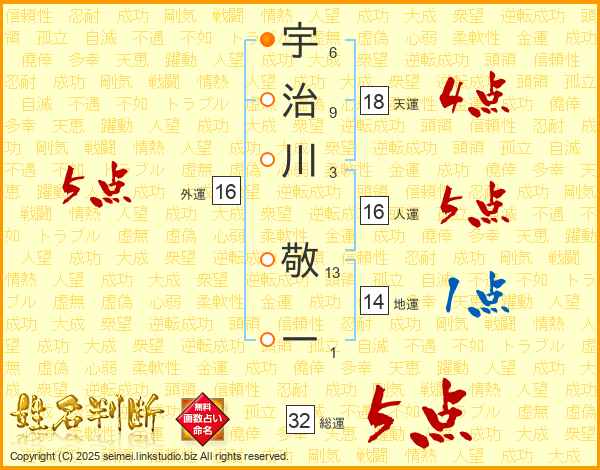 宇(6画)治(9画)川(3画) 敬(13画)一(1画)
