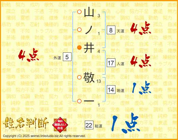 山ノ井敬一さんの総運は22画の1点!