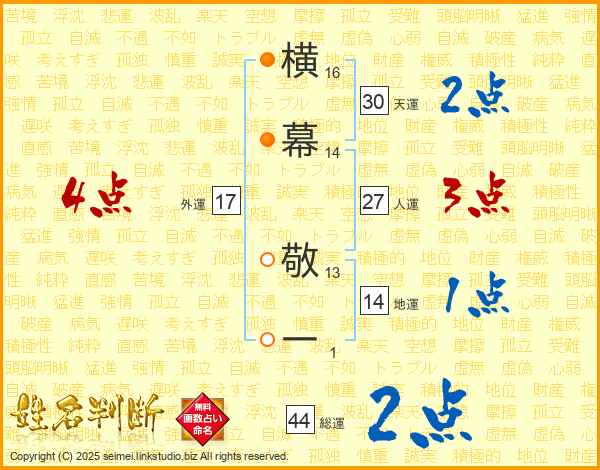 生活面を象徴する運勢です。外部から受ける影響力を表し、結婚運、家庭運や職場、環境への順応性を表します。総運から人運を引いた画数。姓や名が1文字の場合を除く。