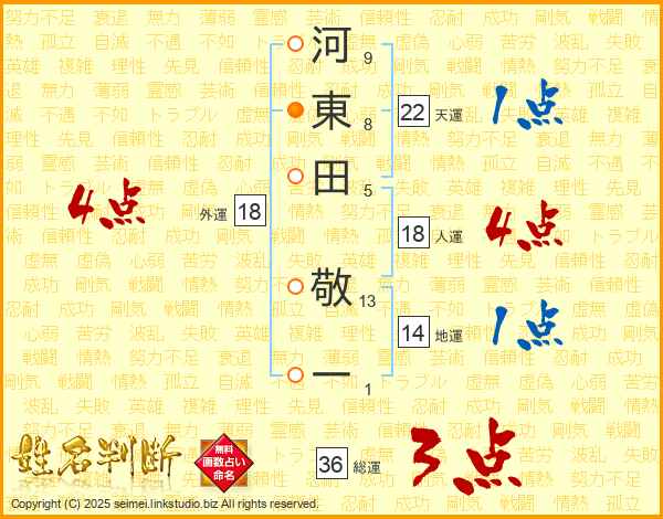 河(9画)東(8画)田(5画) 敬(13画)一(1画)