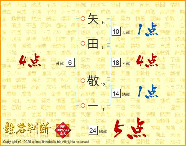 矢田敬一さんの総運は24画の5点!