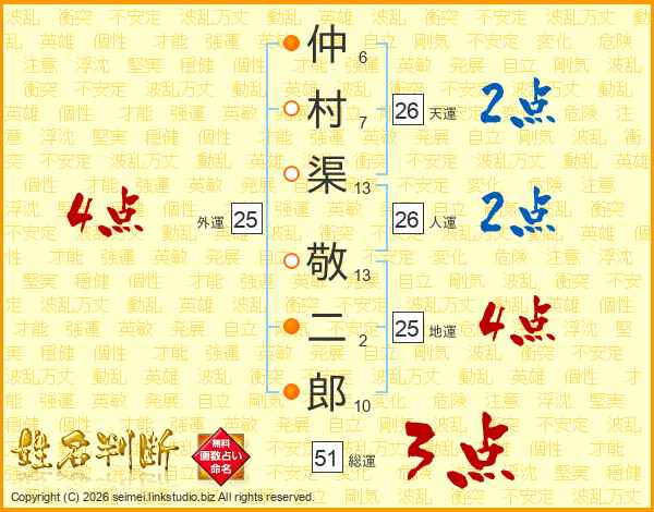 仲(6画)村(7画)渠(13画) 敬(13画)二(2画)郎(10画)