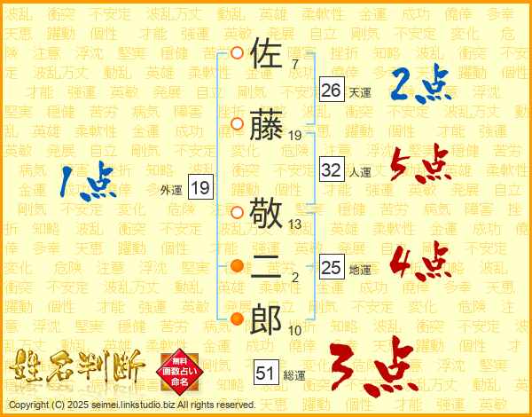 佐(7画)藤(19画) 敬(13画)二(2画)郎(10画)
