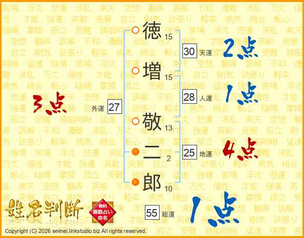 徳(15画)増(15画) 敬(13画)二(2画)郎(10画)