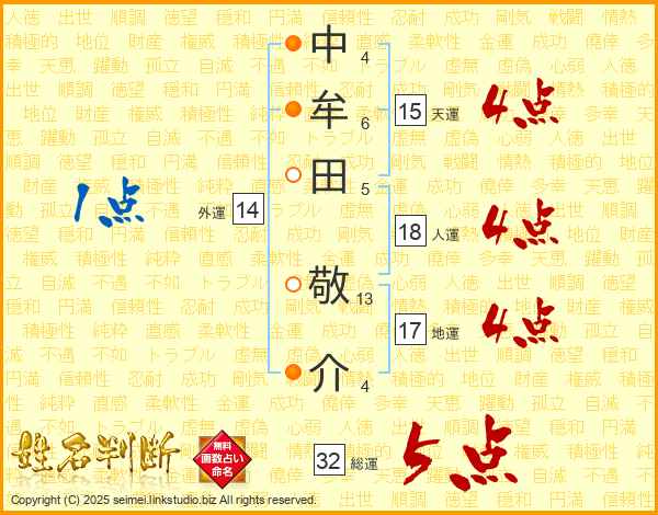 中(4画)牟(6画)田(5画) 敬(13画)介(4画)