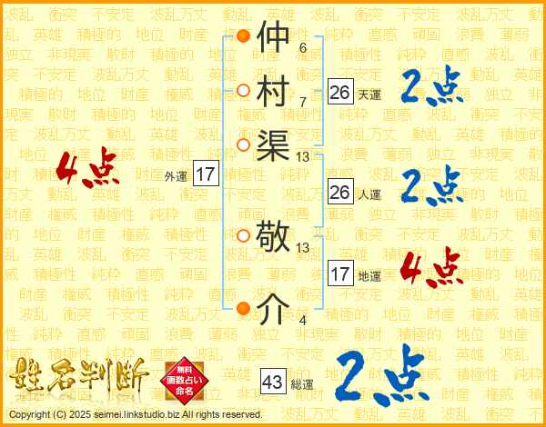 仲(6画)村(7画)渠(13画) 敬(13画)介(4画)