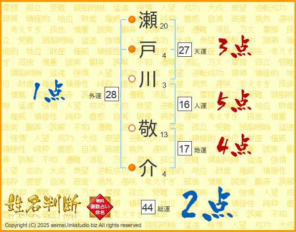 瀬(20画)戸(4画)川(3画) 敬(13画)介(4画)