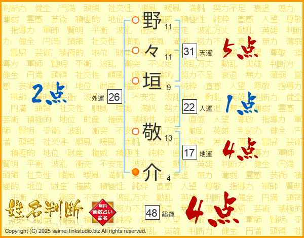 野(11画)々(11画)垣(9画) 敬(13画)介(4画)