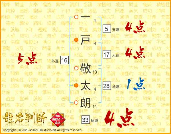 一(1画)戸(4画) 敬(13画)太(4画)朗(11画)