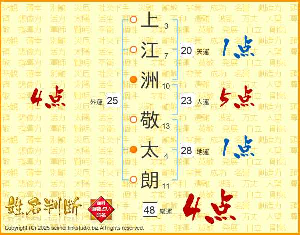 生活面を象徴する運勢です。外部から受ける影響力を表し、結婚運、家庭運や職場、環境への順応性を表します。総運から人運を引いた画数。姓や名が1文字の場合を除く。