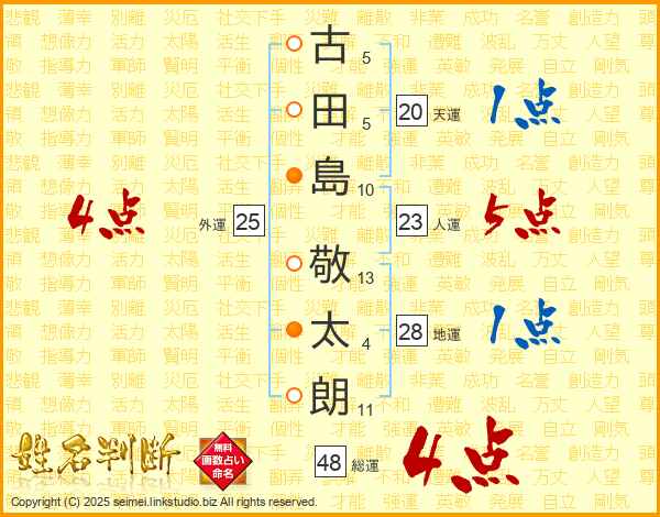 古(5画)田(5画)島(10画) 敬(13画)太(4画)朗(11画)