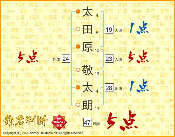 太(4画)田(5画)原(10画) 敬(13画)太(4画)朗(11画)