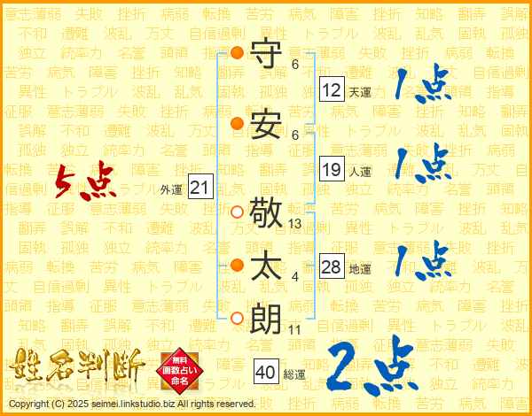 守(6画)安(6画) 敬(13画)太(4画)朗(11画)