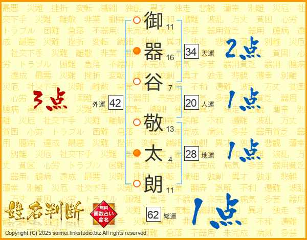 御(11画)器(16画)谷(7画) 敬(13画)太(4画)朗(11画)