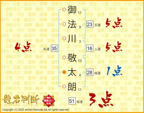 御(11画)法(9画)川(3画) 敬(13画)太(4画)朗(11画)