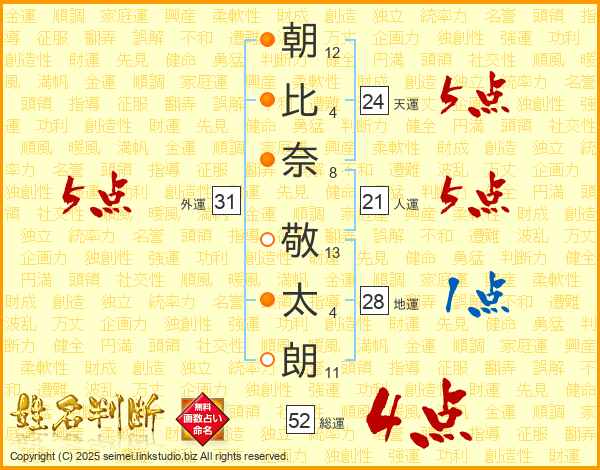 朝(12画)比(4画)奈(8画) 敬(13画)太(4画)朗(11画)