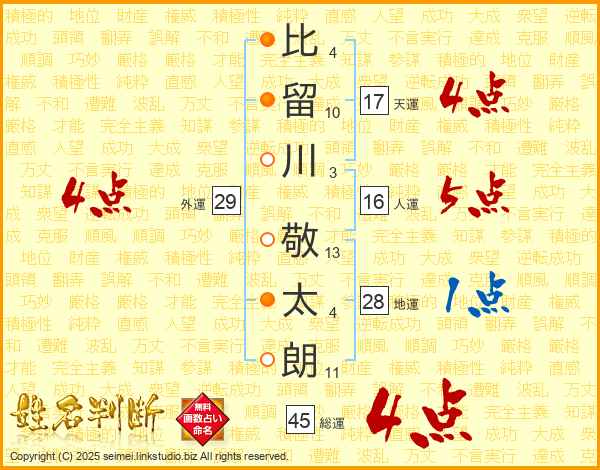 比(4画)留(10画)川(3画) 敬(13画)太(4画)朗(11画)