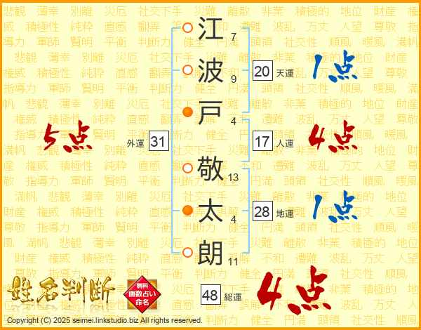 江(7画)波(9画)戸(4画) 敬(13画)太(4画)朗(11画)
