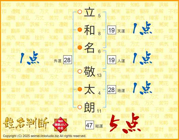 立(5画)和(8画)名(6画) 敬(13画)太(4画)朗(11画)