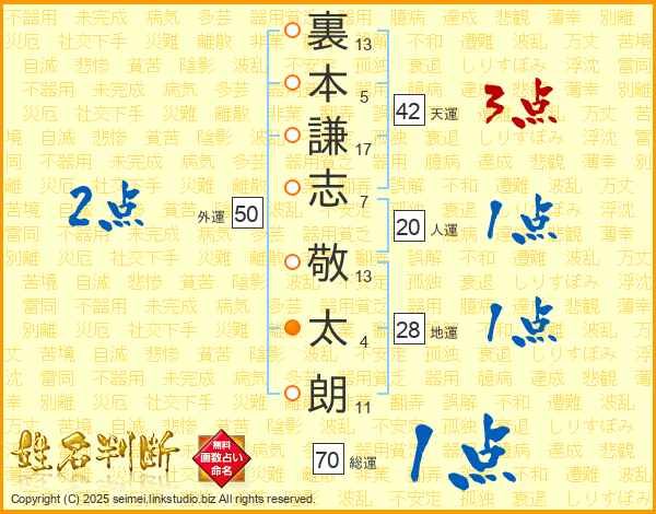 裏(13画)本(5画)謙(17画)志(7画) 敬(13画)太(4画)朗(11画)