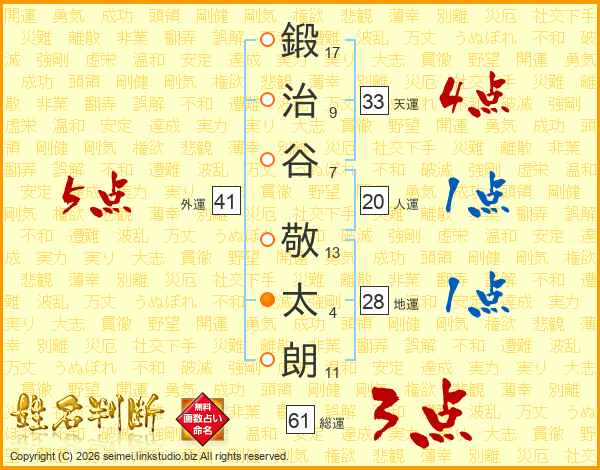 鍛治谷敬太朗さんの天運は33画の4点!