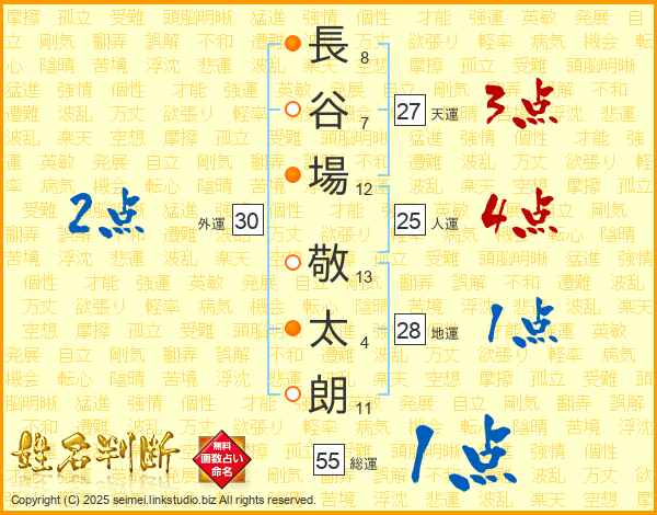 長(8画)谷(7画)場(12画) 敬(13画)太(4画)朗(11画)
