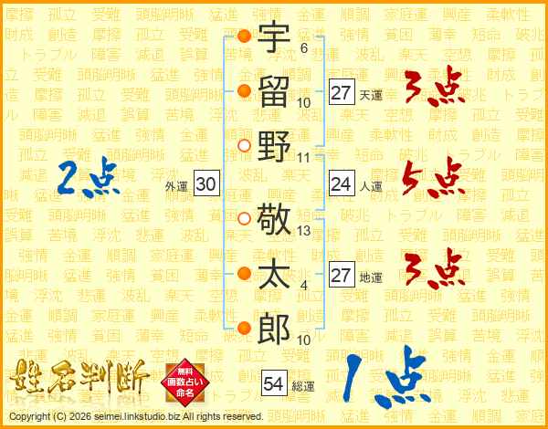 宇(6画)留(10画)野(11画) 敬(13画)太(4画)郎(10画)