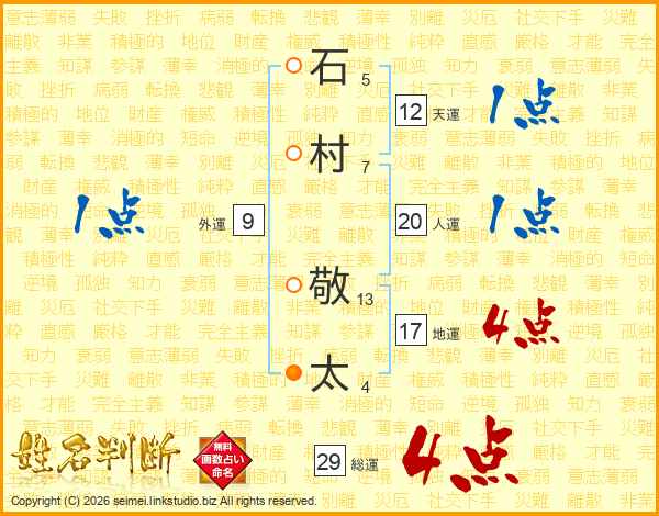 生活面を象徴する運勢です。外部から受ける影響力を表し、結婚運、家庭運や職場、環境への順応性を表します。総運から人運を引いた画数。姓や名が1文字の場合を除く。