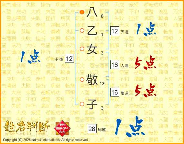 八乙女敬子さんの総運は28画の1点!